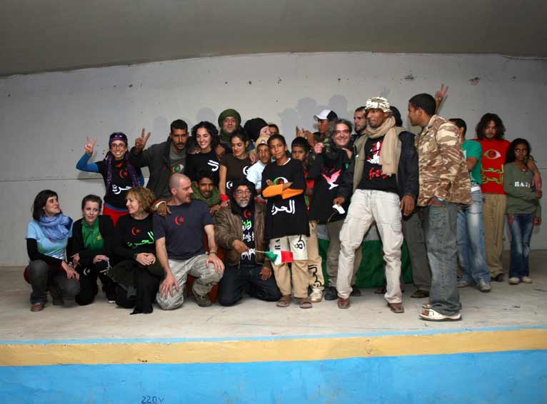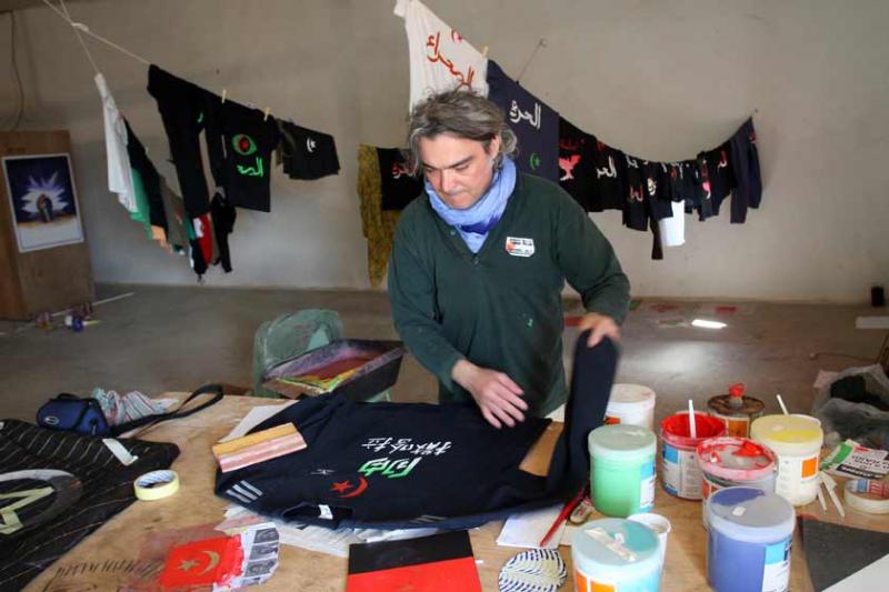 ¡A pintarropa! fue un taller de estampación serigráfica y pintura fosforescente sobre ropa, realizado en colaboración con la población saharaui, los refugiados de los campamentos de Tindouf, beduinos y asistentes a ARTifariti 08. Se trataba de usar la ropa cotidiana: darras, turbantes, melfas, camisetas, pantalones y ropa militar, como un vehículo de comunicación con el mundo donde plasmar los deseos a través de mensajes, siglas, y consignas para afirmar un Sahara libre. El taller culminó en un pase de modelos en el que participamos orgullosos todos los integrantes, una puesta en escena que visibilizaba nuestro arte como una vía para mantener alerta la reflexión sobre la situación que vive el pueblo saharaui.