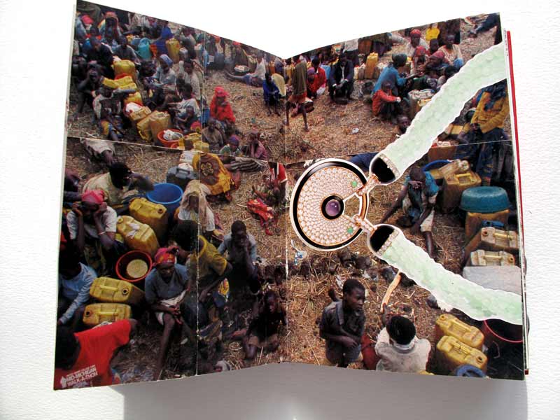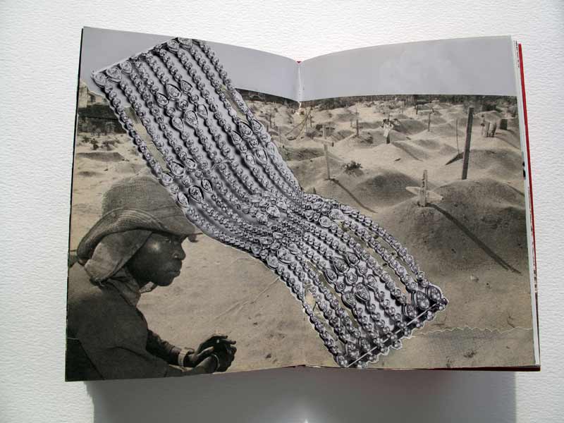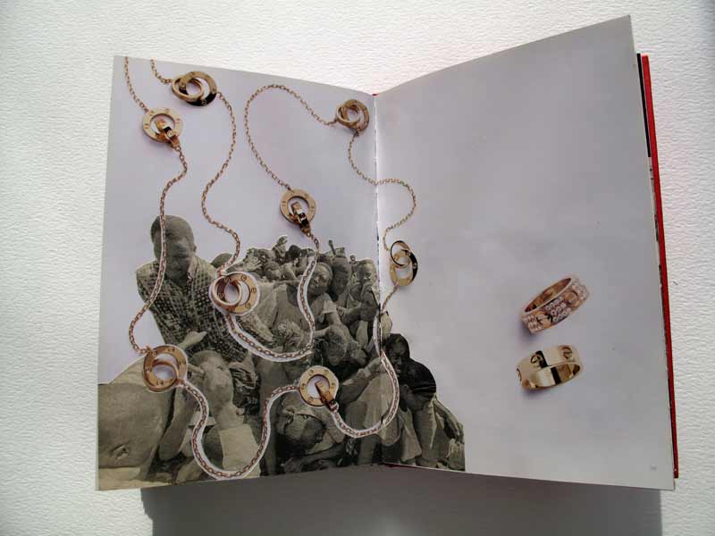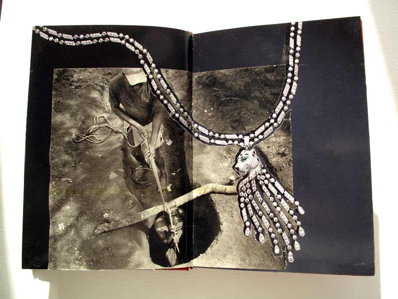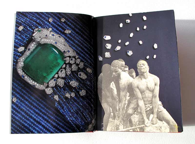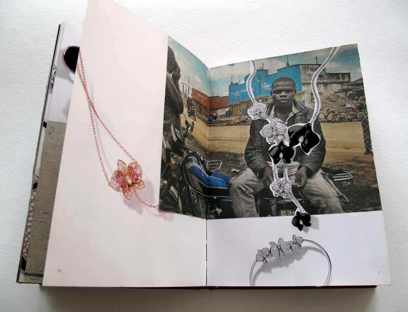 Encontré en la basura un lujoso libro, con pastas duras y papel cuche extra grueso, de una prestigiosa marca de joyería de lujo. He utilizado mi archivo de fotografías de prensa internacional (de mediados de los 90´s hasta 2018) para transformar esta publicación a partir de contra collages. He recortado minuciosamente las fotografías de prensa relativas a las minas de diamantes y piedras preciosas en África, de forma que las fotografías perforadas dejan ver las imágenes exóticas de las joyas ya impresas en el libro.