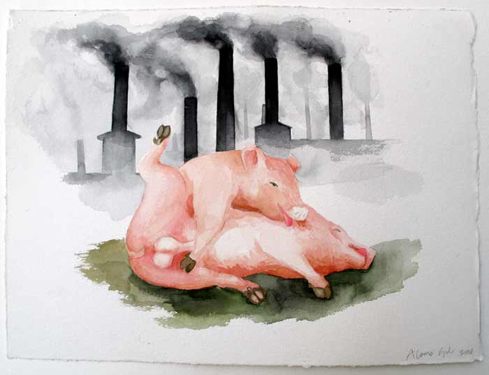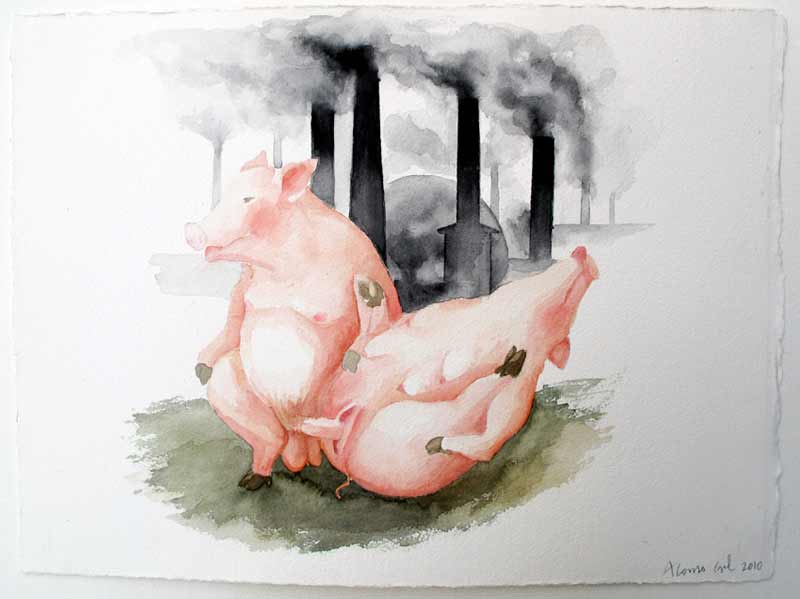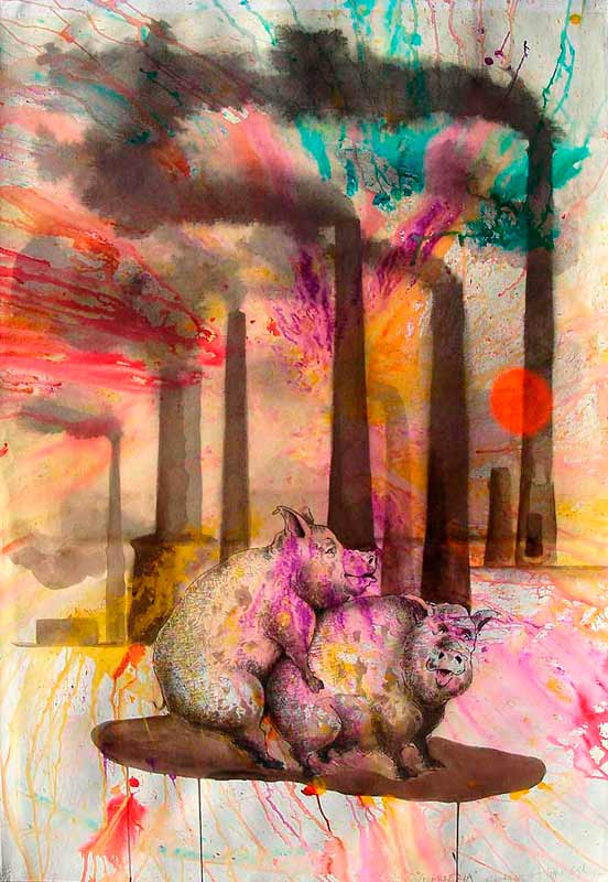 Los dibujos representan el paisaje de chimeneas humeantes donde unos inocentes y rosados cerditos hacen el amor, ajenos al futuro programado por unas políticas económicas marcadas por unos intereses que no son los de la propia comunidad pero sí están legitimados por macropolíticas estructurales que enarbolan el supuestamente imparable progreso.