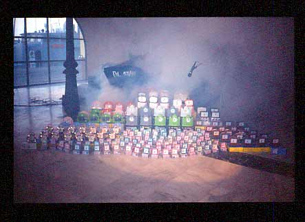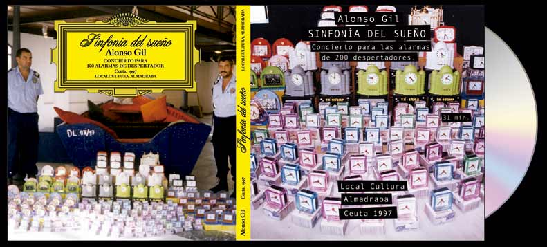 Documentación de la instalación la Sinfonía del sueño, concierto para las alarmas sincronizadas de doscientos relojes despertadores. Tratados como instrumentos, los relojes se colocaron ordenados por grupos de sonidos a modo de orquesta tras la popa de una patera (constituyendo así una suerte de estela marina), que había sido previamente intervenida y configurada como una salón oriental con cojines de enorme tamaño que invitaban al espectador/oyente a tumbarse y transportarse con el concierto.